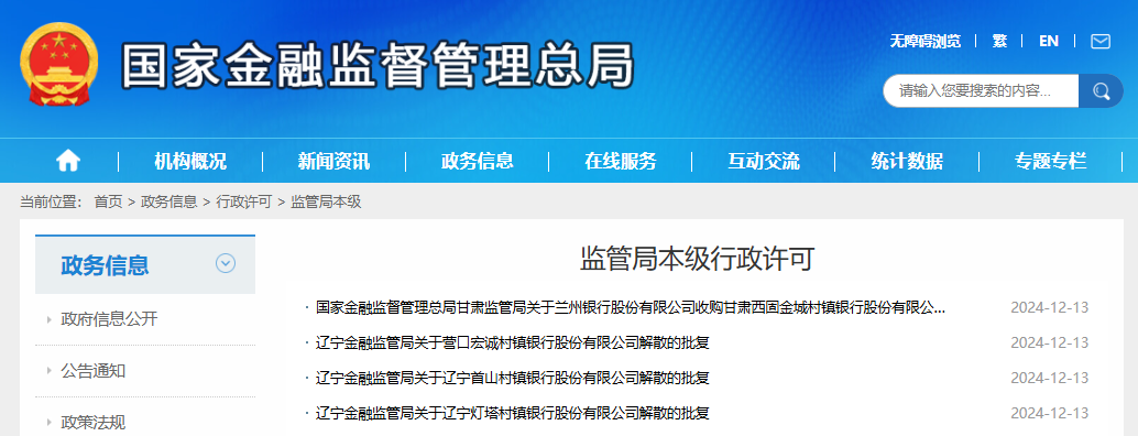 12月13日,国度金融监督束缚总局官网泄漏,兰州银行(001227)获批收购合水县金城村镇银行、甘肃西固金城村镇银行。此外,辽沈银行获批收购营口宏诚村镇银行、辽宁首山村镇银行、辽宁灯塔村镇银行,上述三家银行获批断绝。