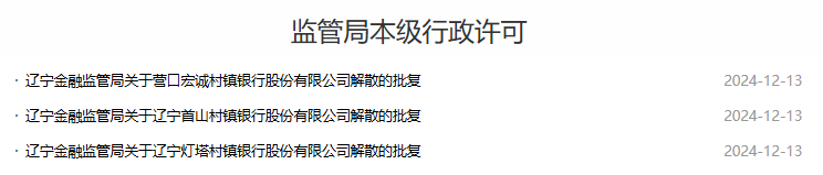 12月13日,国度金融监督束缚总局发布的行政许可泄漏,甘愿营口宏诚村镇银行、辽宁首山村镇银行、辽宁灯塔村镇银行断绝。上述三家银行的全部业务、财产、债权债务、机构网点、东说念主员以过头他各项权力义务由辽沈银行承继。