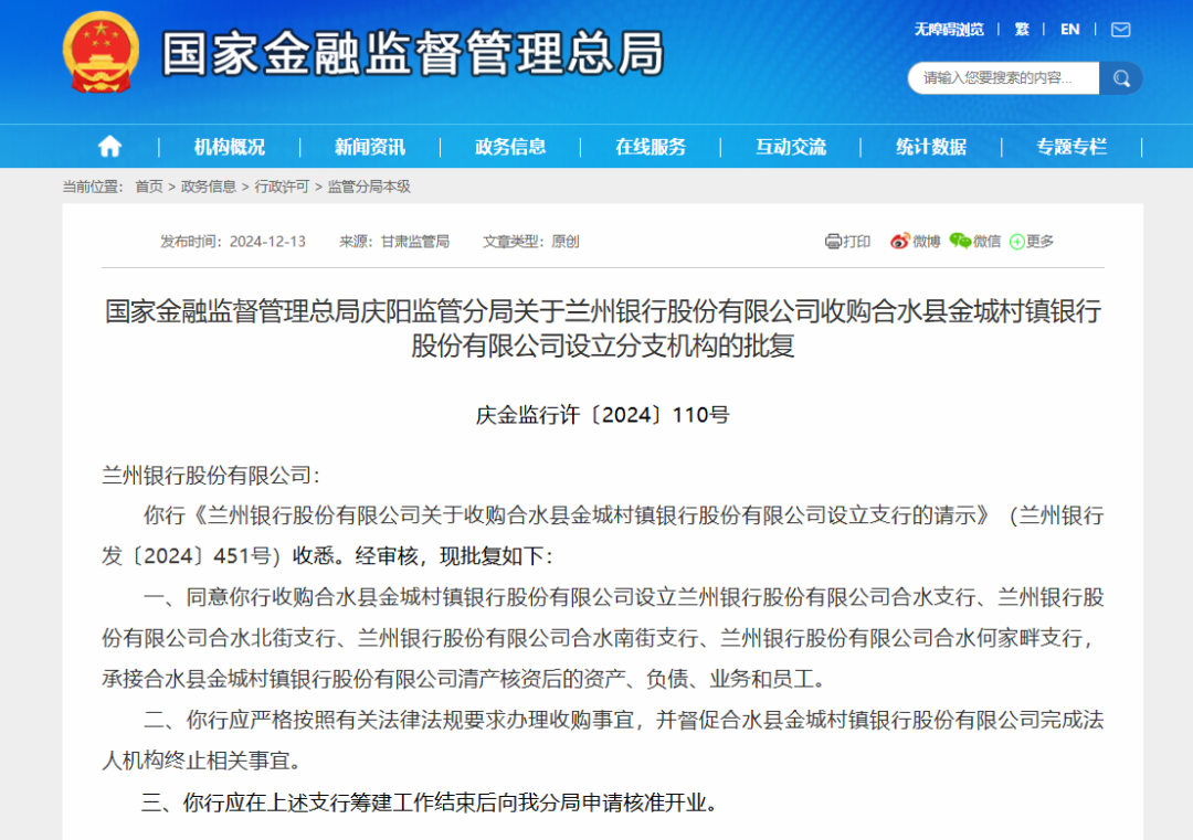 12月13日,国度金融监督束缚总局发布的行政许可泄漏,兰州银行获批收购合水县金城村镇银行建造兰州银行合水支行、兰州银行合水北街支行、兰州银行股份合水南街支行、兰州银行合水何家畔支行,相接合水县金城村镇银行清产核资后的财富、欠债、业务和职工。