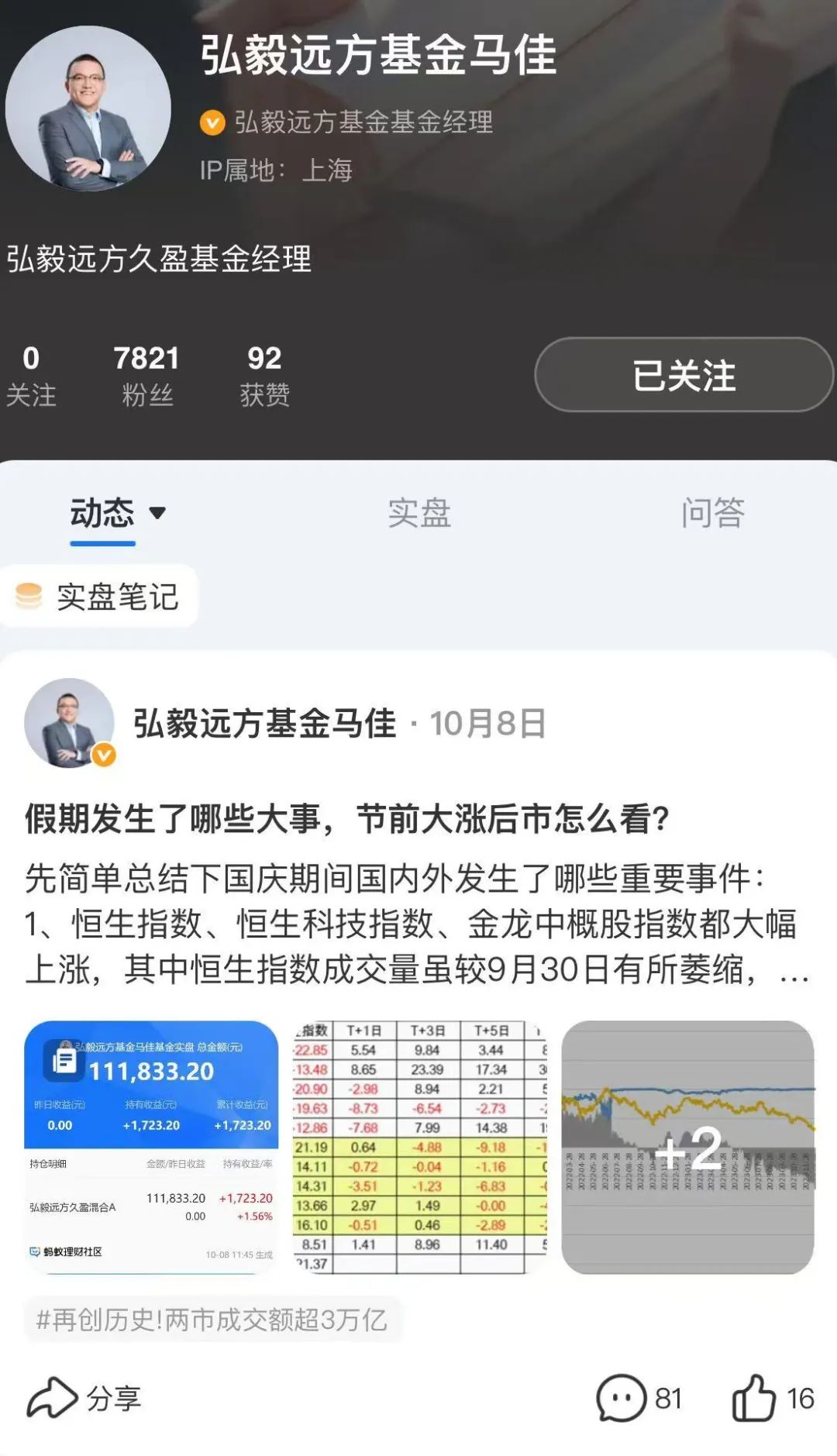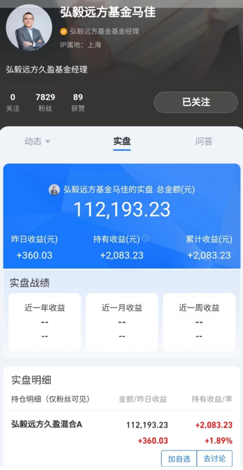 说到弘毅辽远久盈基金司理马佳,也很有特点,他不仅会“作念”何况欢娱“说”。他在蚂蚁答理社区不仅开设了个东谈主号,与基民疏浚互动;还绽开了实盘,与投资者利益深度绑定。