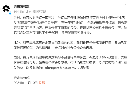 11月11日音问,蔚来法务部发布微博称,收到法院一审判决,法院认定任建华通过其抓有的本日头条账号“小老翁”和懂车帝账号“自得仁者爱任”,在一年多的本事内抓续发布数千条侮辱、乱骂蔚来品牌和用户的实质九游体育app官网,严重侵害了蔚来的权柄。任建华还是删除一谈侵权实质,法院另判决其置顶谈歉不少于60日,并抵偿蔚来经济亏损。